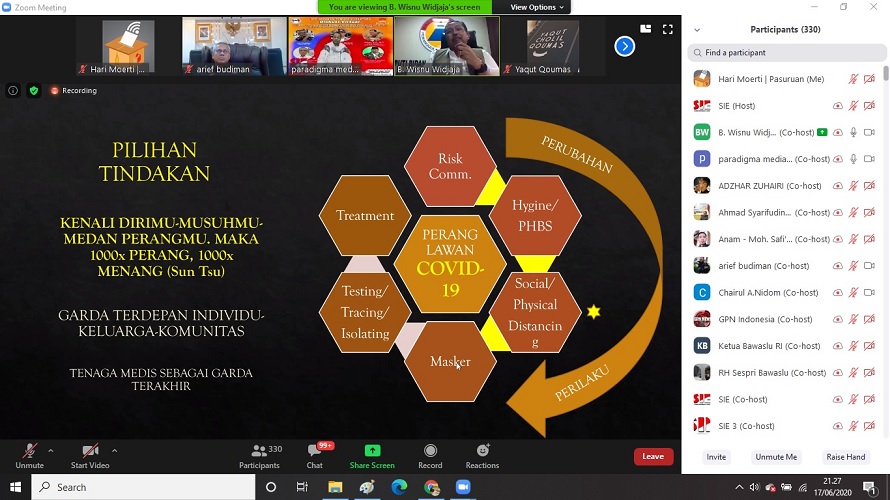 Hal itu disampaikan Wisnu Widjaja, Tim Gugus Tugas Covid-19, saat menjadi salah satu narasumber dalam Diskusi Virtual dengan tema “Upaya Pencegahan TPS Sebagai Cluster Baru Penyebaran Covid-19 di Pilkada Serentak 9 Desember 2020”, pada Rabu malam (17/06/2020). Wisnu Widjaja hadir mewakili Doni Monardo, Ketua Tim Gugus Tugas Covid-19 yang berhalangan hadir.
