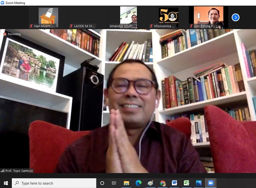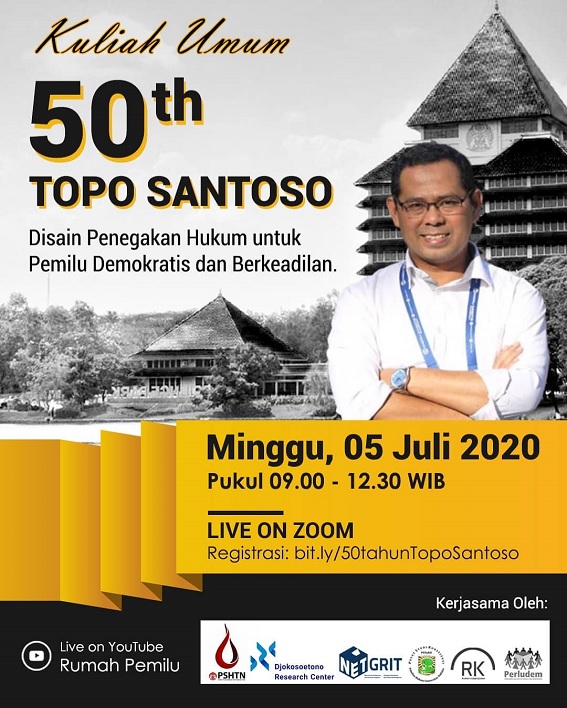 Tepat dihari ulang tahun emas 50 tahun, Topo Santoso memberi Kuliah Umum, yang diberi judul “Paradoks Penegakan Hukum Pemilu di Indonesia”, melalui zoom meeting yang dipandu oleh Khoirunnisa Nur Agustyati, Deputi Direktur Perludem, pada Minggu (05/07/2020).