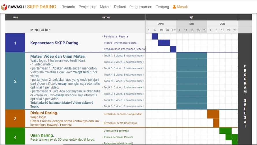 Setelah mengikuti diskusi Daring, tahapan berikutnya semua peserta melaksanakan ujian Daring. Tahapan ini untuk menentukan kelulusan sebagai peserta SKPP Daring yang diselenggarakan oleh Bawaslu RI.