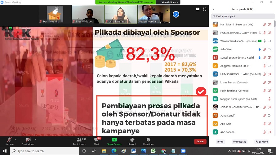 Hal ini diungkapkan Wawan Wardiana, DIrektur Litbang KPK dalam Diskusi Publik dengan tema “Kaum Miskin Kota Dalam Pusaran Politik Uang”, yang diselenggarakan oleh Bawaslu Provinsi Jatim, Rabu (08/07/2020) pagi.