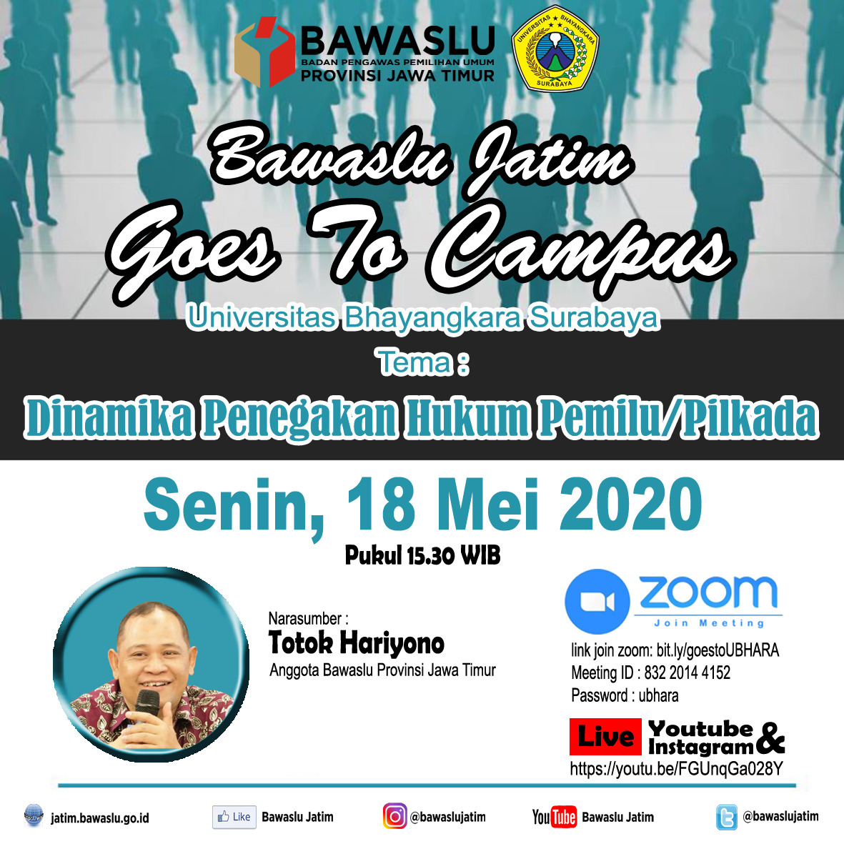 pasuruan.bawaslu.go.id – Pasuruan. Program Bawaslu Jatim Goes to Campus kini memasuki kampus lain, kali ini yang menjadi mitra adalah Universitas Bhayangkara Surabaya (Ubhara), rencananya dengan kampus Ubhara ini akan dilakukan berseri, dimulai hari ini Senin petang (18/05/2020).