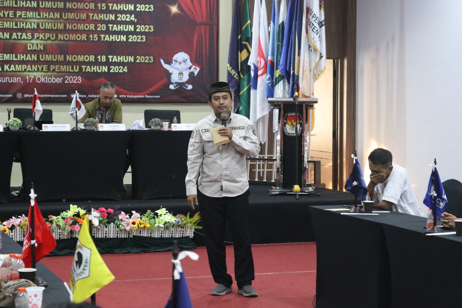 pasuruan.bawaslu.go.id - Bawaslu Kabupaten Pasuruan menghadiri Undangan Sosialisasi Peraturan Komisi Pemilihan Umum (PKPU) 15 Tahun 2023 tentang Kampanye dan PKPU 18 Tahun 2023 tentang Dana Kampanye di KPU Kabupaten Pasuruan. Hadir dalam sosialisasi adalah Zahid Koordiv. Penanganan Pelanggaran dan Data Informasi Bawaslu Kabupaten Pasuruan. Selasa, (17/10/2023).