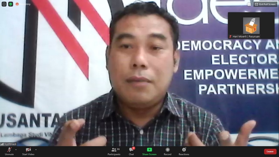 Diskusi Online ini bertajuk, “Keamanan dan Keselamatan Penyelenggara, Peserta, dan Pemilih dalam Pemilihan Serentak di Masa Pandemi Covid-19”, dengan menghadirkan sejumlah narasumber kompeten. Salah satu narasumber adalah Yusfitriadi, selaku Ketua Yayasan Visi Nusantara Maju dan Direktur DEEP Indonesia.