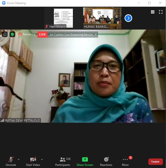 pasuruan.bawaslu.go.id – Surabaya. Ratna Dewi Pettalolo, Komisioner Bawaslu RI menyampaikan, kita sekarang tidak punya pilihan, sudah ada kepastian dimulainya tahapan Pilkada Lanjutan pada 15 Juni, meski banyak diskusi dari banyak kalangan yang mempertanyakan, tugas kita bagaimana mempersiapkannya dengan baik. Hal ini disampaikannya pada Halal Bihalal Daring Bawaslu se- Provinsi Jawa Timur, Senin pagi (01/06/2020).