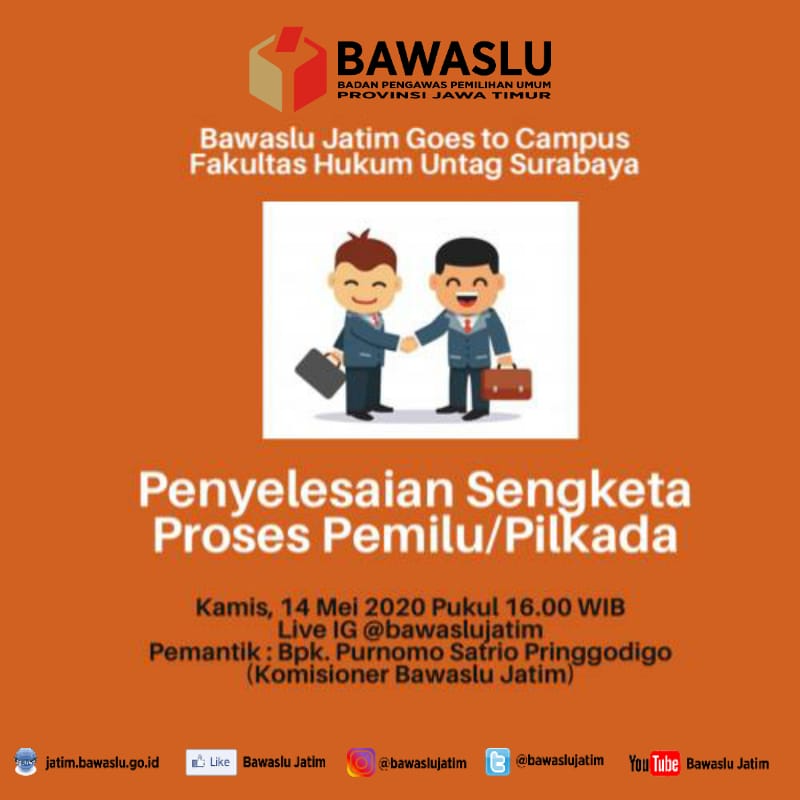 Kemitraan yang dijalin melalui diskusi dengan civitas akademika FH Untag Surabaya dengan tema “Penegakan hukum kepemiluan” dilakukan secara berseri setiap hari, 11-14 Mei 2020 jelang berbuka puasa dan disiarkan langsung melalui Instagram: @fakultashukumuntagsby dan @bawaslujatim.