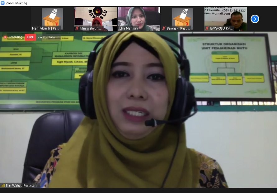Hal itu disampaikan oleh Erri Wahyu Puspitarini, candidat PhD Universitas UTeM Malaysia sekaligus Ketua STMIK Yadika Bangil yang menyampaikan topik berkaitan dengan “Good IT Governance”,dalam forum webinar Bawaslu Mendengar seri #2 “Urgensitas Penggunaan IT dan Pelibatan Generasi Milenial dalam Pengawasan Pemilu”, yang diselenggarakan oleh Bawaslu Kabupaten Pasuruan, Rabu (05/08/2020).