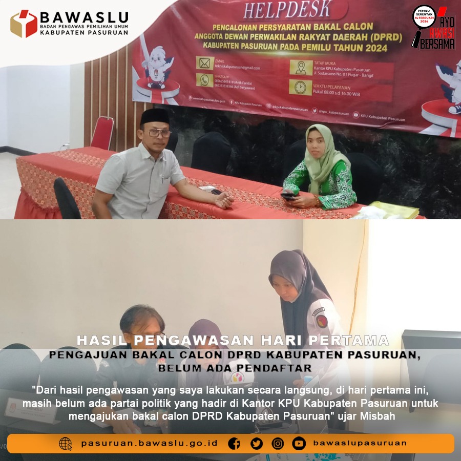 Sebagaimana disampaikan Misbahul Munir Anggota Bawaslu Kabupaten Pasuruan yang menjadi penanggung Jawab Tim Fasilitasi pelaksanaan pengawasan pendaftaran calon DPRD Kabupaten Pasuruan. "Dari hasil pengawasan yang saya lakukan secara langsung, di hari pertama ini, masih belum ada partai politik yang hadir di Kantor KPU Kabupaten Pasuruan untuk mengajukan bakal calon DPRD Kabupaten Pasuruan" ujar Misbah