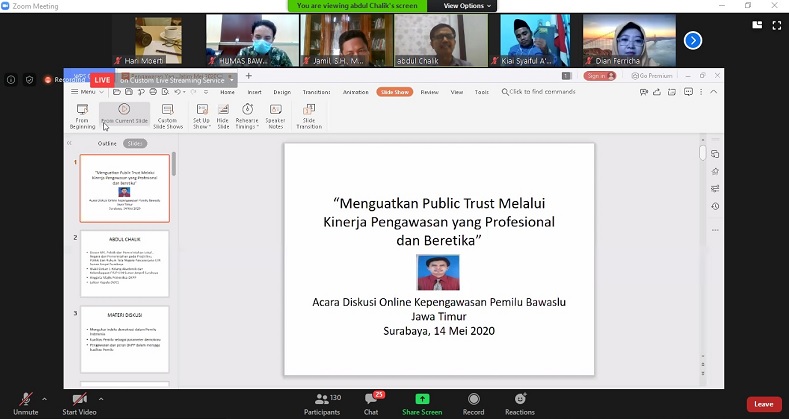 Chalik menyampaikan materi tentang, “Menguatkan trust public, melalui kinerja pengawasan yang profesional dan beretika”. Diskusi via daring itu diikuti oleh seluruh pimpinan Bawaslu Provinsi Jawa Timur dan seluruh pimpinan Bawaslu Kabupaten/Kota se- Jawa Timur, termasuk. Hari Moerti, salah satu Komisioner Bawaslu Kabupaten Pasuruan mengakses pertemuan daring itu dari rumahnya, di Kraton, Pasuruan.
