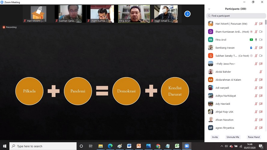 Webinar IMMH UI ini mengambil tema “Pelaksanaan Pilkada dalam Era New Normal: Tantangan dan Kelemahan”. Webinar ini dipandu oleh Harmoko M. Said dari IMMH UI, dan peserta mencapai batas maksimal 300 orang dari berbagai kalangan, termasuk diantaranya Hari Moerti, Komisioner Bawaslu Kabupaten Pasuran.