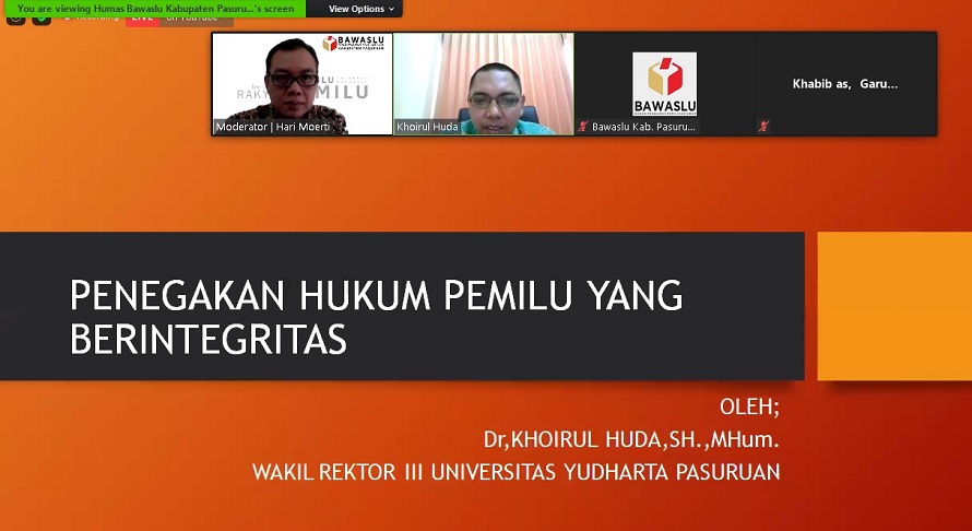 Hal itu disampaikan Khoirul Huda, Wakil Rektor 3 Universitas Yudharta Pasuruan, saat menjadi narasumber dalam webinar Bawaslu Mendengar seri #4 dengan tema “Kajian Penegakan Hukum Pemilu”, yang diselenggarakan oleh Bawaslu Kabupaten Pasuruan dan dipandu oleh Hari Moerti, Kordiv Hukum, Data dan Informasi Bawaslu Kabupaten Pasuruan, Rabu (19/08/2020).