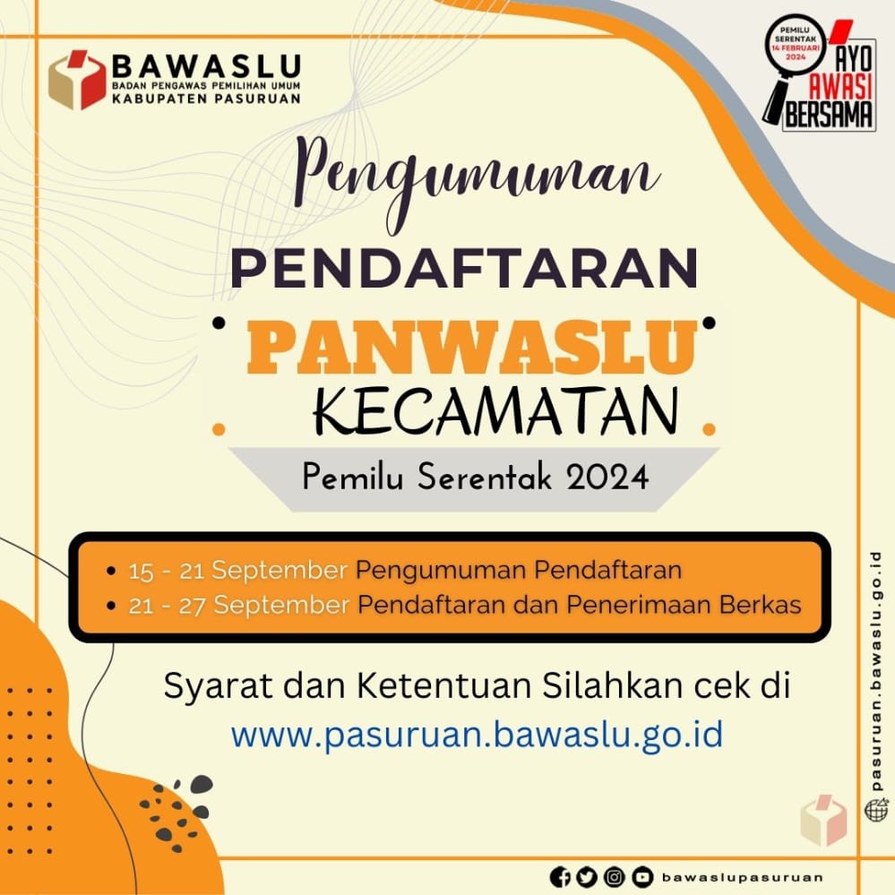 Dalam rangka pembentukan Panwaslu Kecamatan dalam Pemilu serentak tahun 2024, Kelompok Kerja Pembentukan Panwaslu Kecamatan Kabupaten Pasuruan berdasarkan Peraturan Badan Pengawas Pemilihan Umum Republik Indonesia Nomor 19 Tahun 2017 sebagaimana telah diubah terakhir dengan Peraturan Badan Pengawas Pemilihan Umum Republik Indonesia Nomor 8 Tahun 2019, atas kewenangan yang diberikan oleh Undang-Undang Nomor 7 Tahun 2017, membuka kesempatan bagi Warga Negara Indonesia yang memenuhi persyaratan untuk mendaftarkan diri sebagai calon anggota Panwaslu Kecamatan.