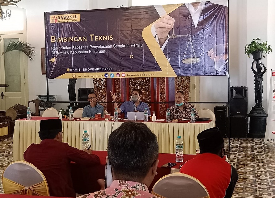 Hal itu disampaikan Sri Sugeng Pujiatmiko, selaku salah satu narasumber dalam Bimbingan Teknis Peningkatan Kapasitas Penyelesaian Sengketa Pemilu, yang diselenggarakan oleh Bawaslu Kabupaten Pasuruan, di Kaliandra resort, Prigen Pasuruan, pada Kamis (5/11/2020).