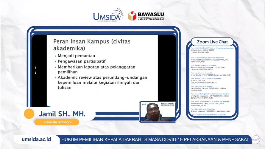 Webinar ini hasil kerjasama antara UMSIDA dengan Bawaslu Kabupaten Sidoarjo, dan disiarkan melalui zoom meeting dan live streaming YouTube channel UMSIDA 1912, yang diikuti oleh civitas akademika UMSIDA dan terbuka untuk umum, termasuk diikuti oleh Hari Moerti, Komisioner Bawaslu Kabupaten Pasuruan.
