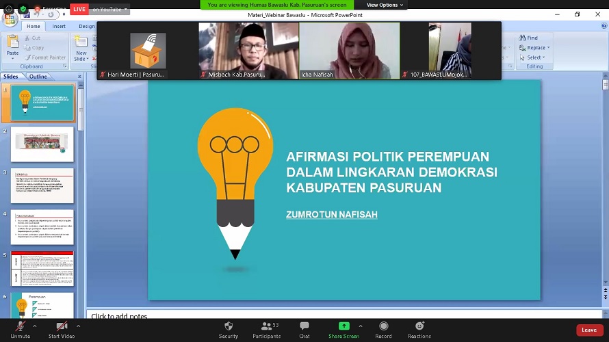 Hal itu disampaikan Zumrotun Nafisah, aktivis perempuan asal Pasuruan dalam webinar Bawaslu Mendengar seri #3 dengan tema “Mengawal Agenda Perempuan dalam Demokrasi dan Pengawasan”, yang diselenggarakan oleh Bawaslu Kabupaten Pasuruan, Rabu (12/08/2020).