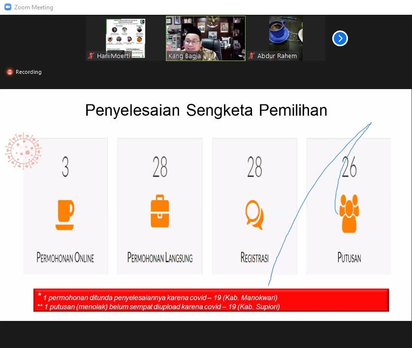 Dalam Penyelesaian Sengketa, terdapat 3 permohonan online, 28 permohonan langsung, 28 teregistrasi, dan 26 putusan. Sedangkan yang 2 terdampak Covid-19 sehingga ditunda penyelesaiannya dan belum diunggah.