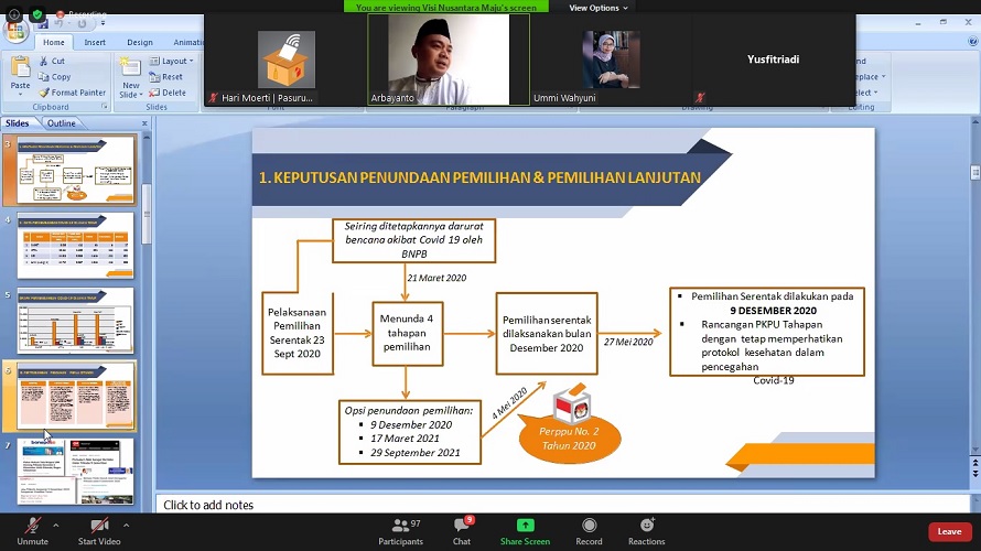 Diskusi Online ini disiarkan melalui Zoom Meeting dan diikuti dari beragam latar belakang peserta dan berbagai daerah, termasuk Hari Moerti, Komisioner Bawaslu Kabupaten Pasuruan.