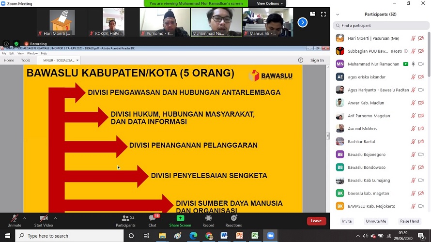 Ini disampaikan Bachtiar dalam pembukaan “Sosialisasi Perbawaslu Nomor 3 Tahun 2020” secara daring melalui zoom meeting, Senin (29/06/2020) pagi. Sosialisasi ini diikuti oleh Kordiv Hukum, Data dan Informasi Bawaslu Provinsi Jatim, Purnomo Satriyo Pringgodigdo serta 38 Kordiv Hukum, Data dan Informasi Bawaslu Kabupaten/Kota se-Jatim, termasuk Hari Moerti, selaku Kordiv Hukum, Data dan Informasi Bawaslu Kabupaten Pasuruan.
