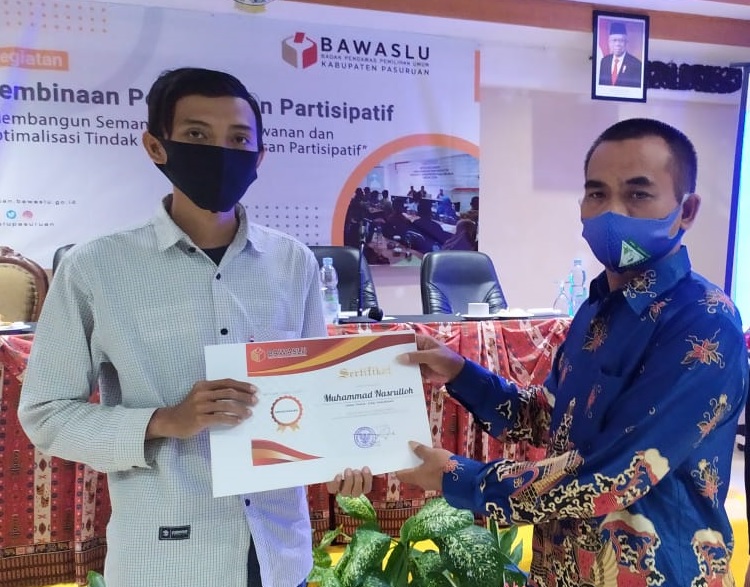 Diakhir acara, Ketua Bawaslu Kabupaten Pasuruan, Mohamad Nasrup menyerahkan sertifikat peserta Sekolah Kader Pengawas Partisipatif (SKPP) daring angkatan 2020 yang ditandatangani oleh Ketua Bawaslu RI, Abhan.[#HM]
