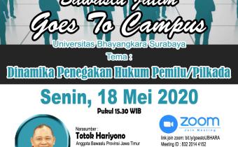 pasuruan.bawaslu.go.id – Pasuruan. Program Bawaslu Jatim Goes to Campus kini memasuki kampus lain, kali ini yang menjadi mitra adalah Universitas Bhayangkara Surabaya (Ubhara). Setelah seri satu, hari ini seri 2, dilakukan pada Rabu petang (20/05/2020).